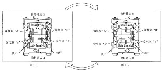 當(dāng)軸桿以滿沖程移至右邊時(shí),空氣開(kāi)關(guān)被切換,壓縮空氣進(jìn)入空氣室a(左側(cè),見(jiàn)圖1.2)中,軸桿向左移動(dòng)。容料室A中的物料被擠出,同時(shí)物料被吸進(jìn)容料室B中。